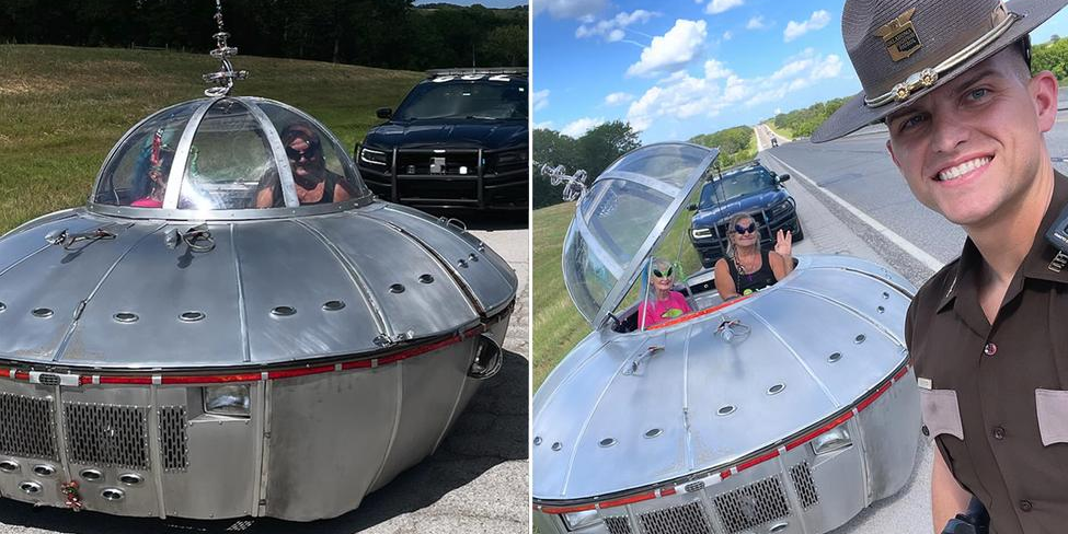 A spaceship-like vehicle en route to a festival in New Mexico was pulled over by Oklahoma Highway Patrol for an obstructed tag, with Trooper Ryan Vanvleck taking a selfie with the unique car.